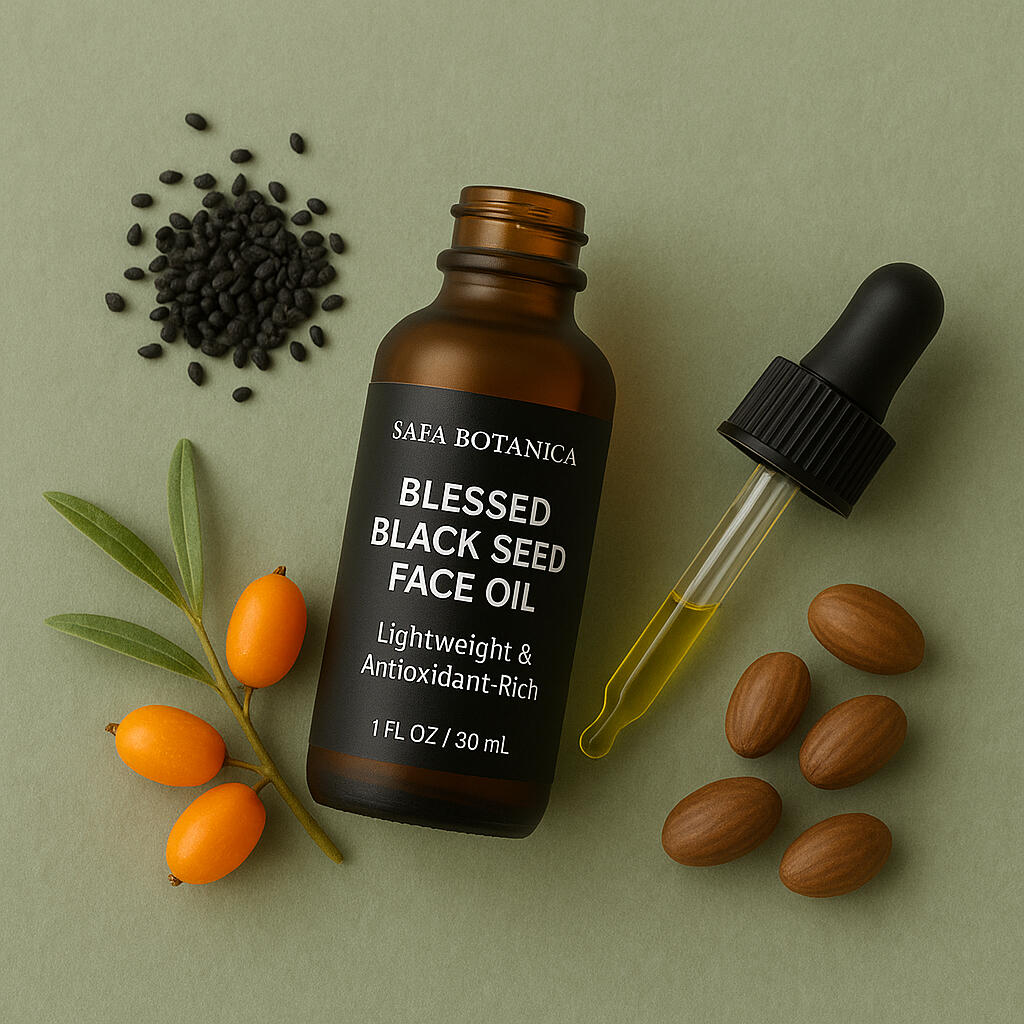 Known as the "Seed of Blessing," black seed oil (Nigella sativa) is celebrated for its extraordinary ability to calm inflammation, fight free radicals, and promote skin renewal. Rich in antioxidants and essential fatty acids, it forms the foundation of our expertly crafted face oil blend, delivering hydration and healing for a radiant complexion.